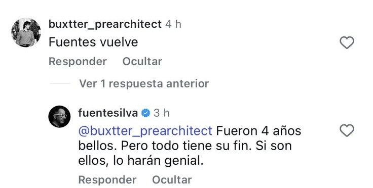A través de un comentario en una publicación de Instagram de Ojo a la Tele, donde un usuario escribió “Fuentes vuelve”, el conductor del matinal Buenos Días a Todos respondió con un mensaje que rápidamente llamó la atención: “Fueron 4 años bellos. Pero todo tiene su fin, si son ellos lo harán genial”, comentó el animador.
