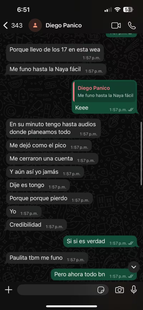 Además, Glock compartió una captura de pantalla en la que supuestamente Diego Pánico le confiesa que la pelea con Naya Fácil habría sido un tongo. No obstante, es importante precisar que en la conversación difundida no aparece la fotografía del influencer. Lo que podría generar dudas respecto a la autenticidad del chat.