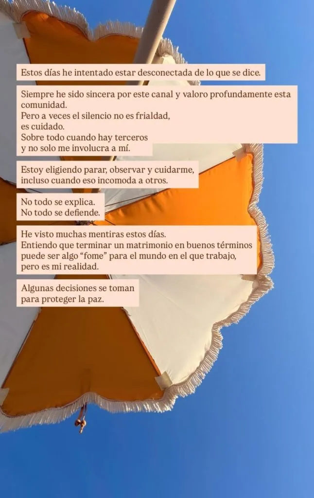 Pero a veces el silencio no es frialdad, es cuidado. Sobre todo cuando hay terceros y no solo me involucra a mí. Estoy eligiendo parar, observar y cuidarme, incluso cuando eso incomoda a otros”, comentó.
